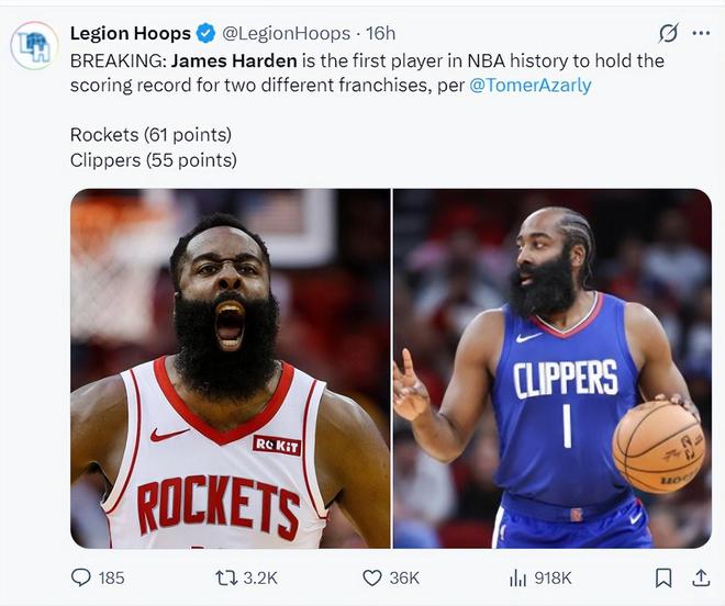 9.历史唯一,哈登拥有快船(55)、火箭(61)两支球队的单场最高;