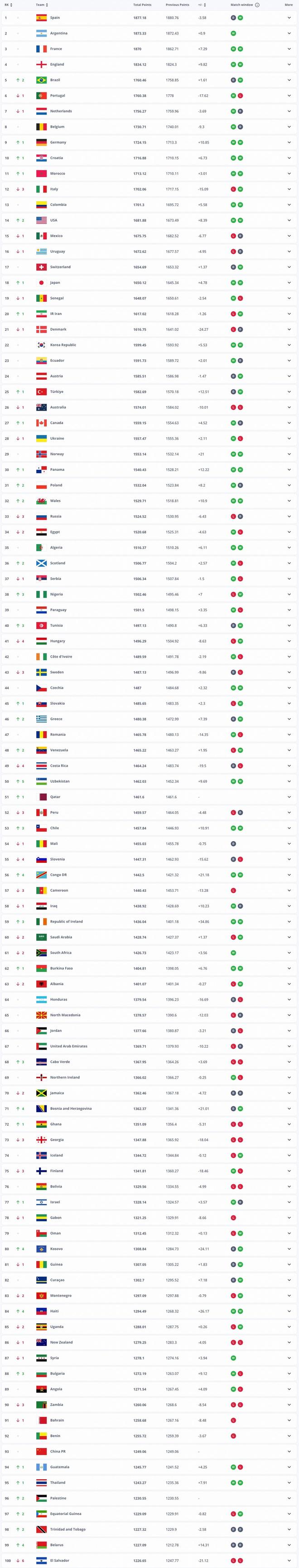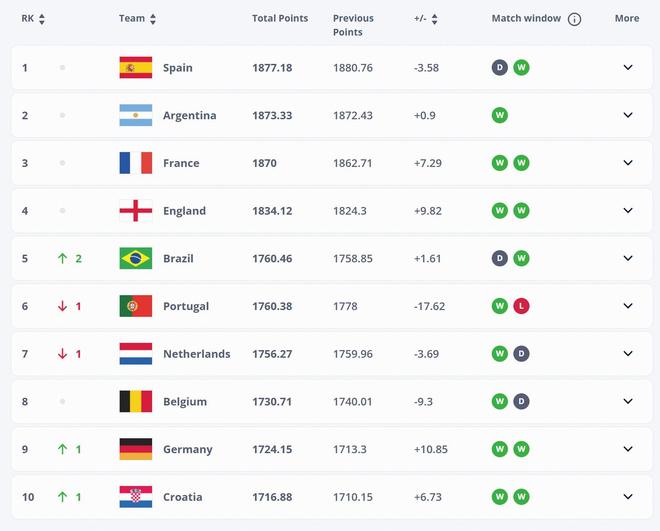 FIFA最新世界排名:西阿法英巴葡荷比德锁定世界杯种子队;中国仍居第93