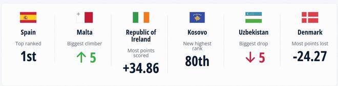 本期排名更新中,西班牙仍居首位;马耳他上升名次最多,上升5位;乌兹别克斯坦下降名次最多,下降5位。